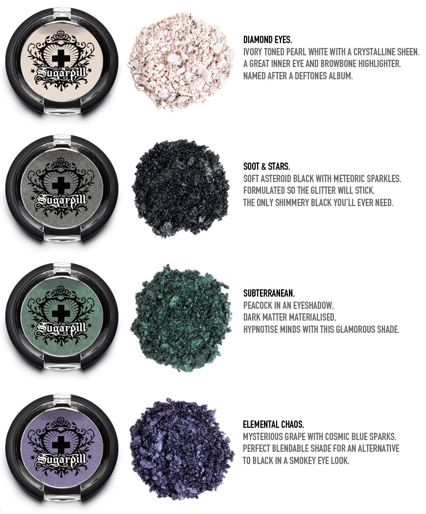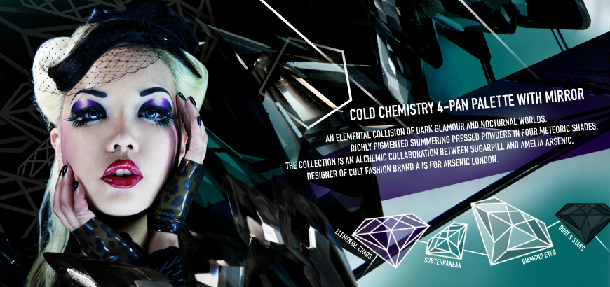 I am exceedingly thrilled to be able to finally unveil the Cold Chemistry collection, an alchemic collaboration between Sugarpill and my brand A is for Arsenic. An elemental collision of dark glamour and nocturnal worlds, the collection features 4 meteoric shimmering shades called Diamond Eyes, Soot & Stars, Elemental Chaos and Subterranean.